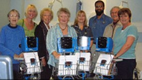 Prof. Peter Lewis, of Ewell Adult School, with the DASH Monitoring Equipment (£5,000) for the Day Care Unit at Epsom General Hospital, with Sister Jenny Broadrick and patient Michelle Sparrow. The DASH can continuously monitor a patient's vital signs.