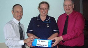 Cllr. Eber Kingston and Ewell Court Resident's Association, Les Duplock, presenting a £295 Spirometer for the Clinical Assessment Ward to Sister Amanda Elgar, following a fund raising Quiz Night. The Spirometer will play a vital role in respiratory problems.