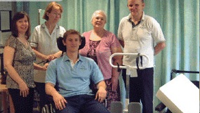 Kerry Foods, Egham, presenting a £2,000 Cirrus Wheelchair (Tilt in Space) and other therapy equipment to Neuro Physio & Occupational Health Therapists, Stroke Unit. The Cirrus Wheelchair is no ordinary wheelchair playing a vital role in a stroke patients rehabilitation and along with other therapy equipment will help patients to resume as near normal life as possible.